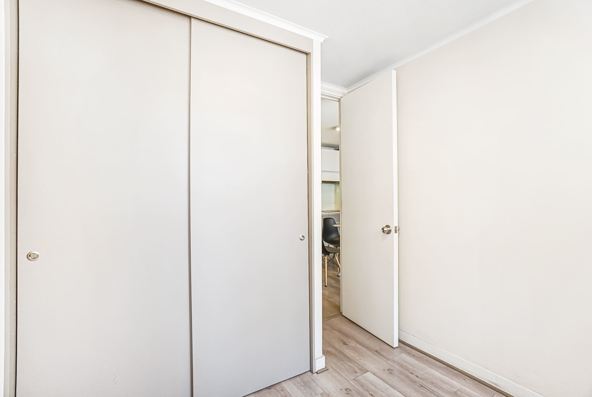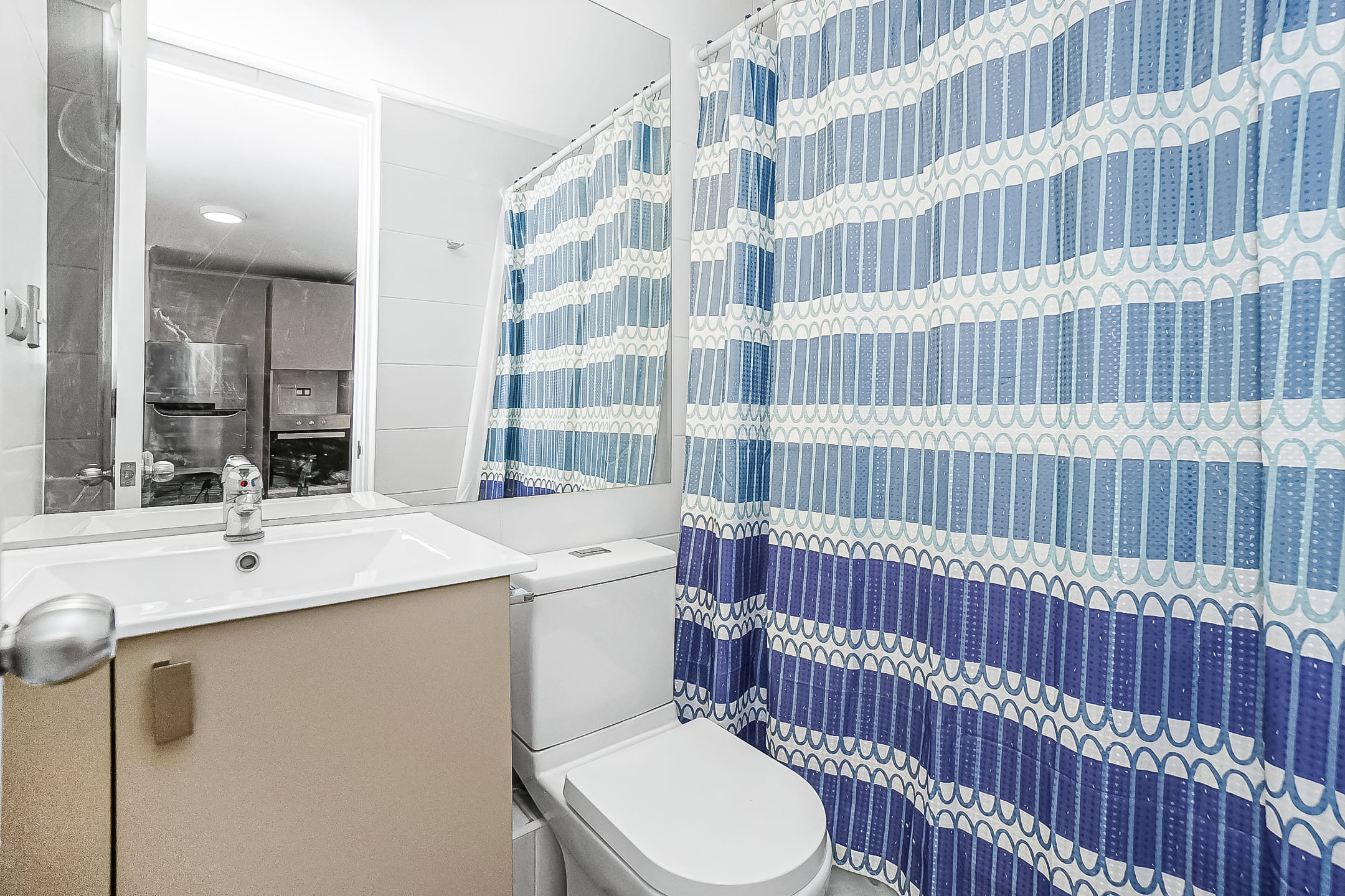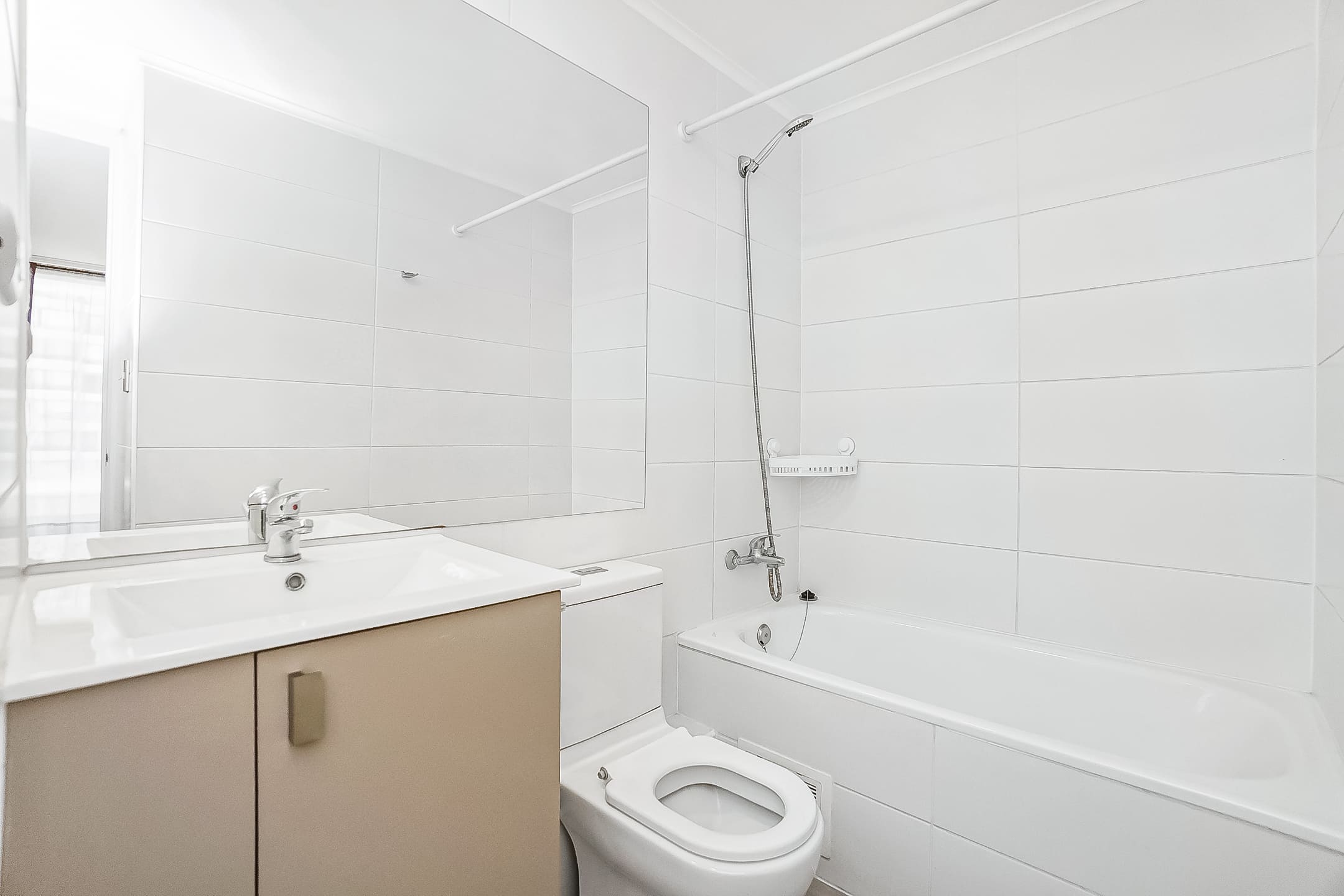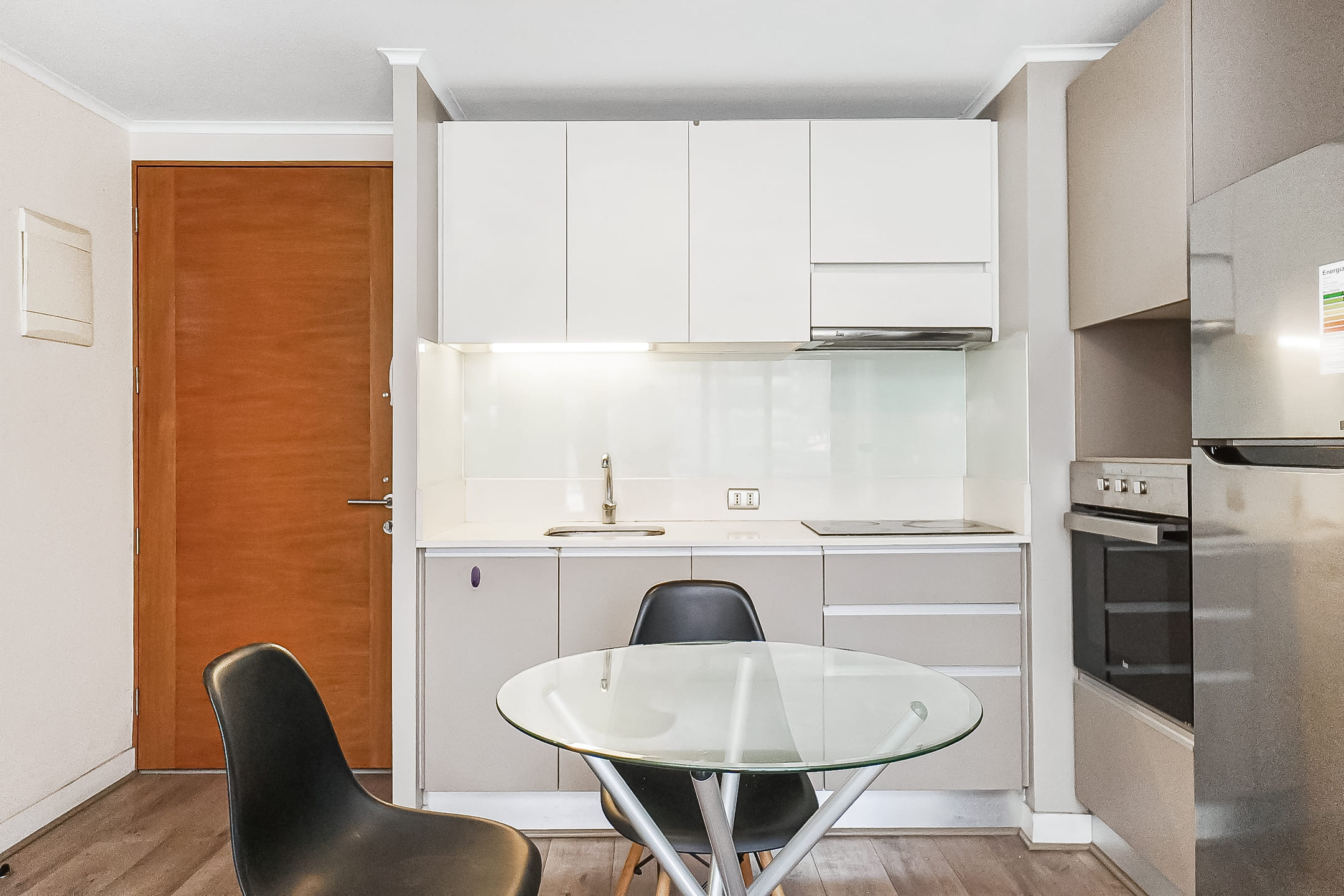 Al ingresar se aprecia el living-comedor junto con salida a terraza con vista al patio interior de orientación al Norte. La cocina está integrada, con cubierta de cuarzo y equipada con encimera de vitrocerámica 3 platos y conexión a lavadora.