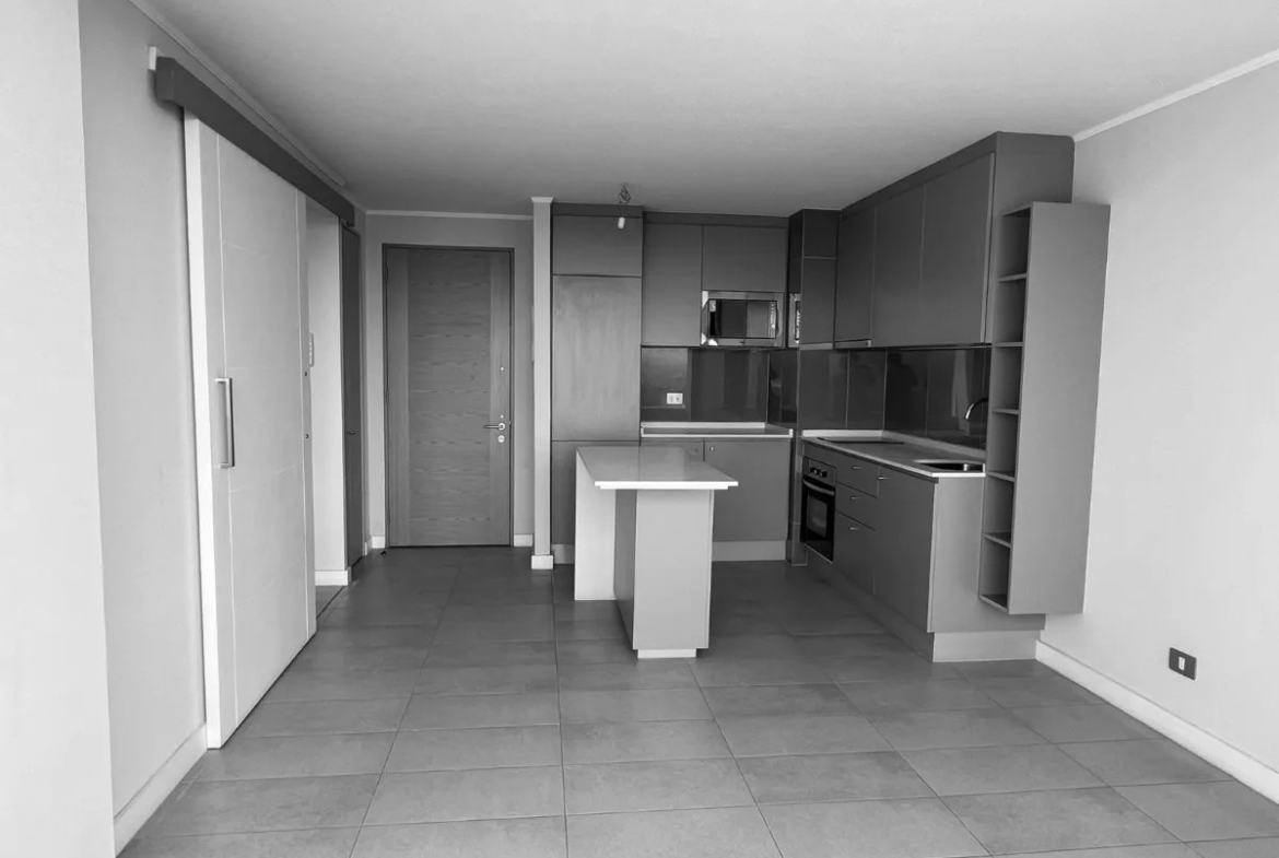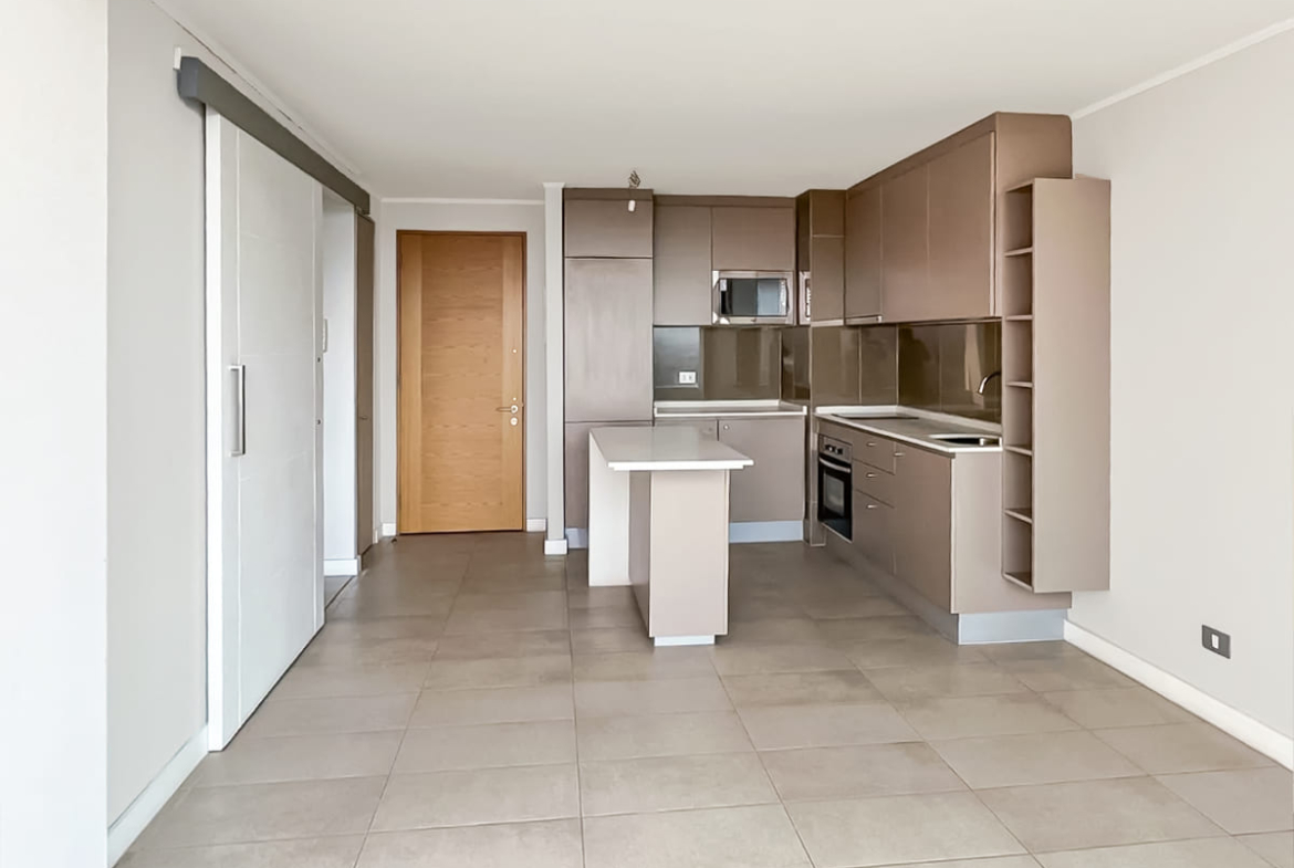Al entrar al departamento, serás recibido por un acogedor living-comedor que se ilumina gracias a su orientación al Sur-Oriente, amplios ventanales y salida a terraza. La cocina americana, equipada y amoblada, cuenta con cubierta de granito, encimera de vitrocerámica de 2 platos, horno y campana.