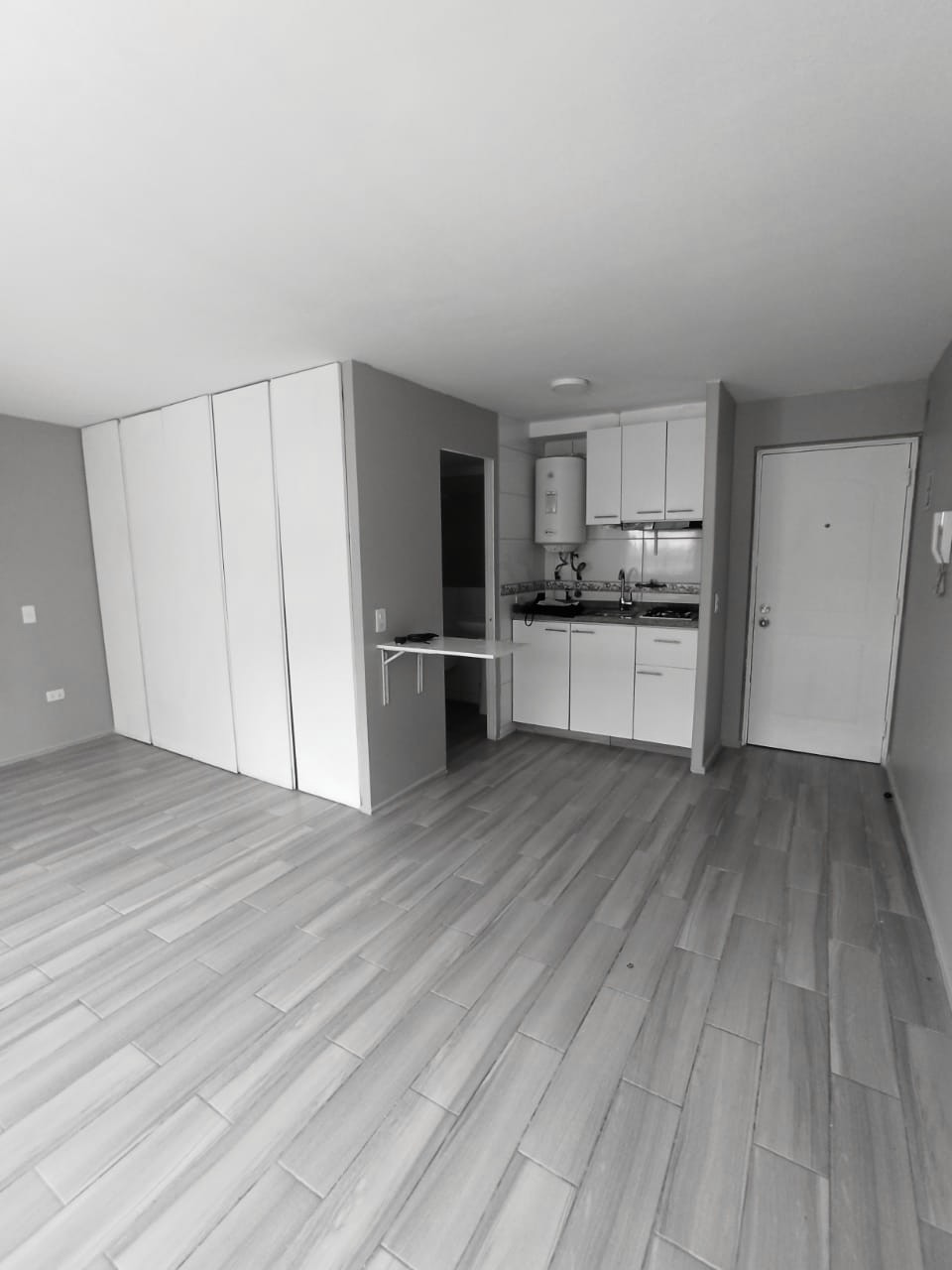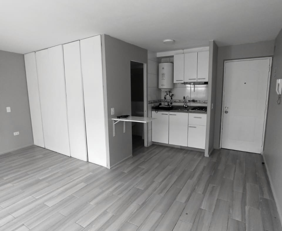 Al entrar al departamento, serás recibido por un acogedor living-comedor con cocina integrada. La cocina americana, equipada y amoblada, cuenta con cubierta de granito, encimera a gas de 2 platos. A un costado, encontrarás un práctico closet y el acceso al baño con conexión a lavadora.