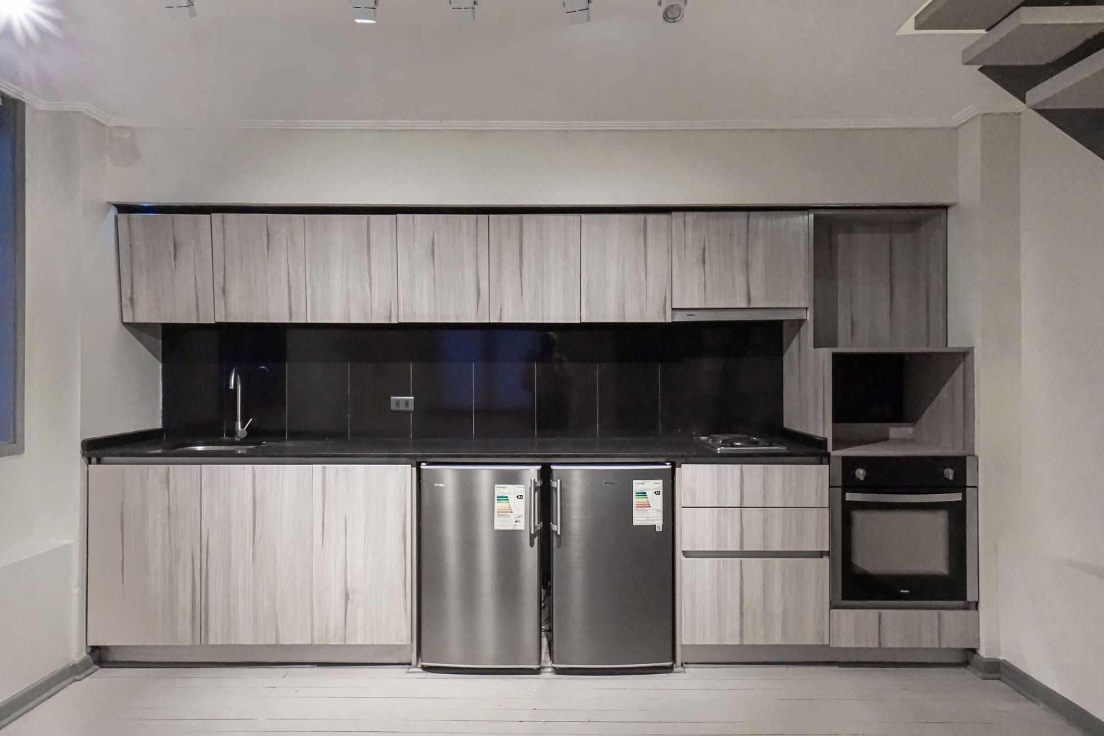 El primer piso integra living y comedor en un ambiente amplio y funcional, con cocina abierta equipada con cubierta de granito, encimera eléctrica de dos platos, horno y campana. Destacan sus pisos de madera y ventanas de PVC.