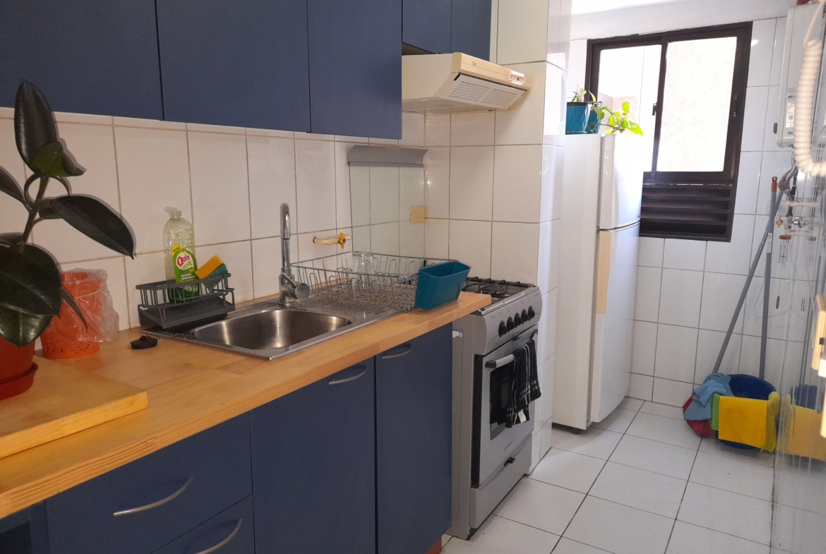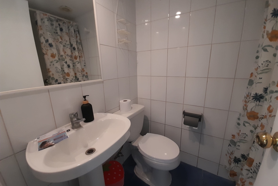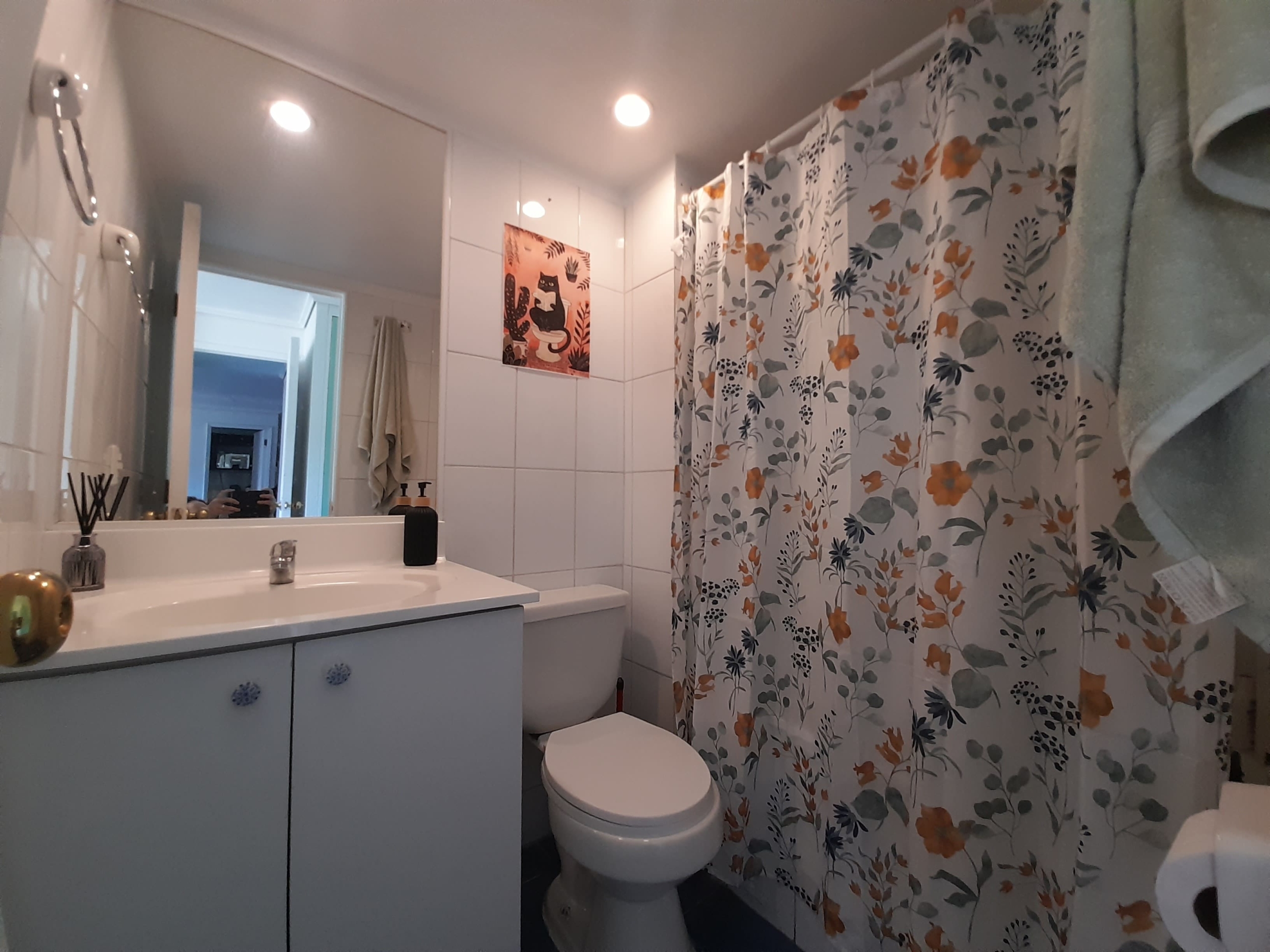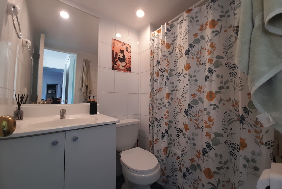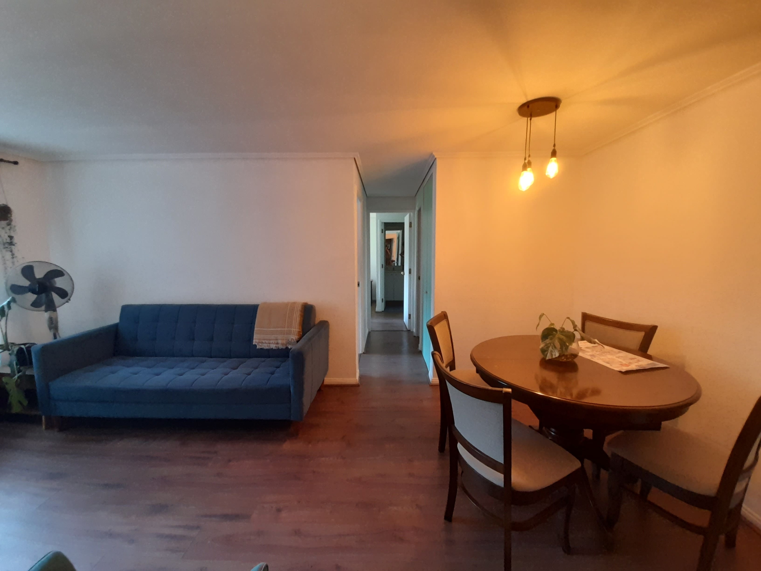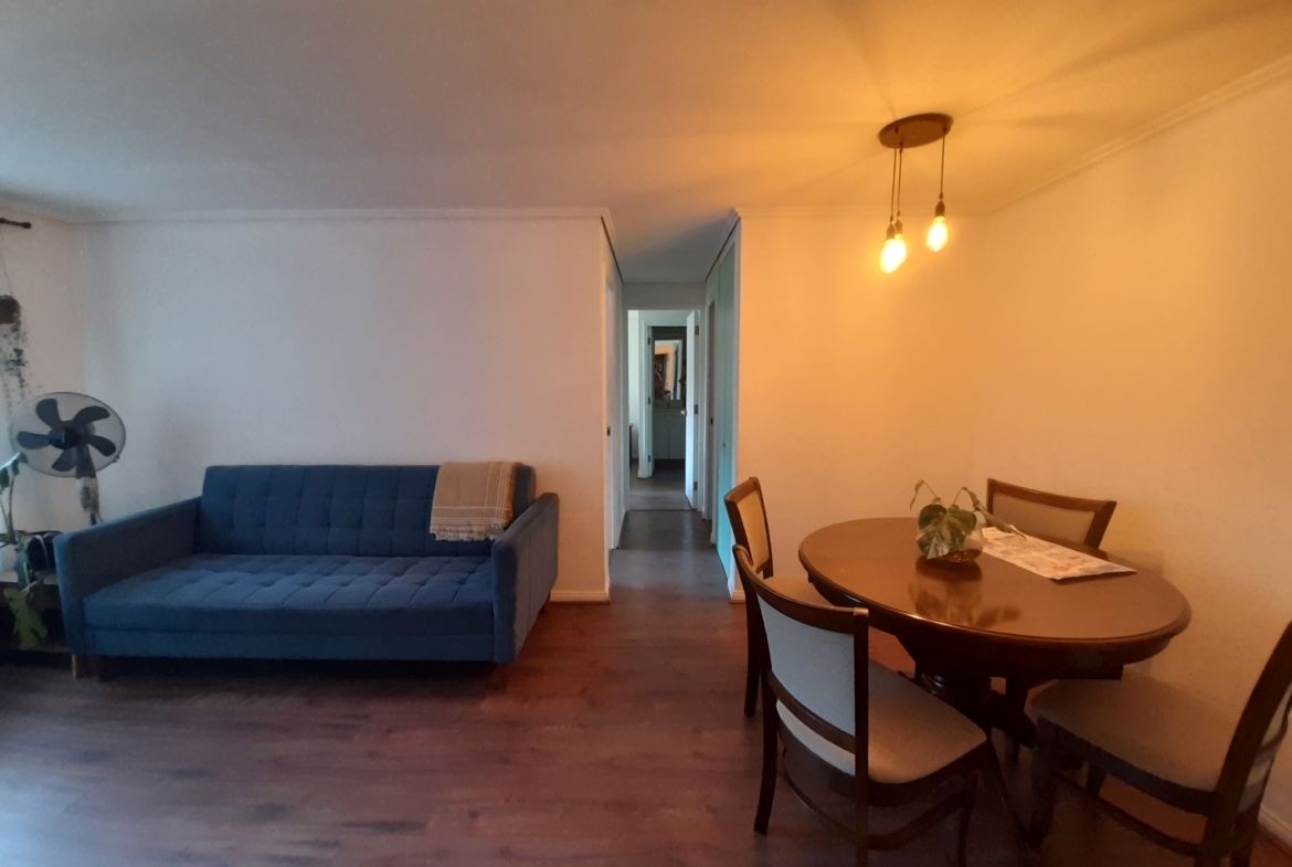 El área de estar integra living y comedor juntos. La cocina es independiente y está equipada con cubierta de madera, encimera a gas de 4 platos, horno, campana y conexión a lavadora. Entre sus terminaciones destacan el piso flotante en excelente estado y las ventanas de aluminio, que aportan confort térmico y acústico. Su distribución considera dos dormitorios y dos baños completos el principal con tina y en suite.
